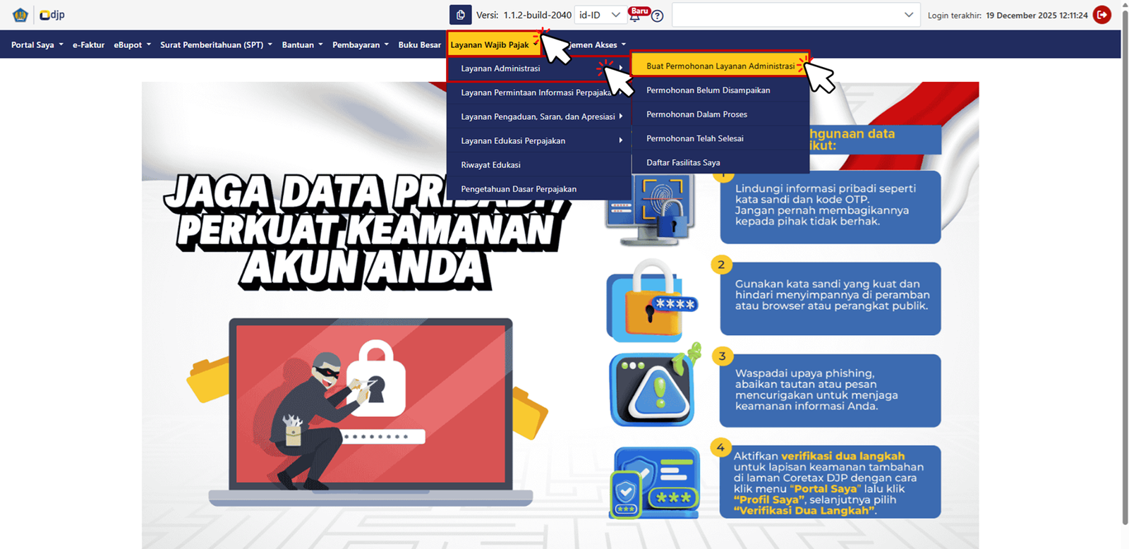 Login ke Coretax (coretaxdjp.pajak.go.id), Klik Tombol Layanan Wajib Pajak-->Layanan Administrasi --> Buat Permohonan Layanan Administrasi