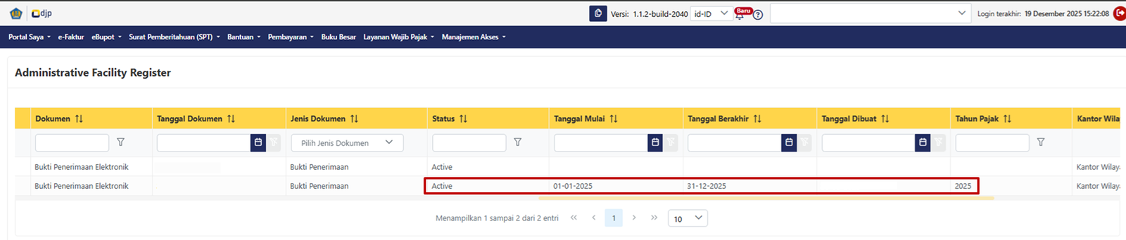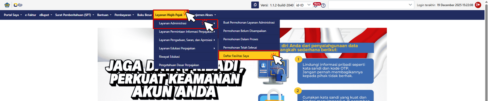 Klik Tombol Layanan Wajib Pajak-->Layanan Administrasi -->Daftar Fasilitas Saya