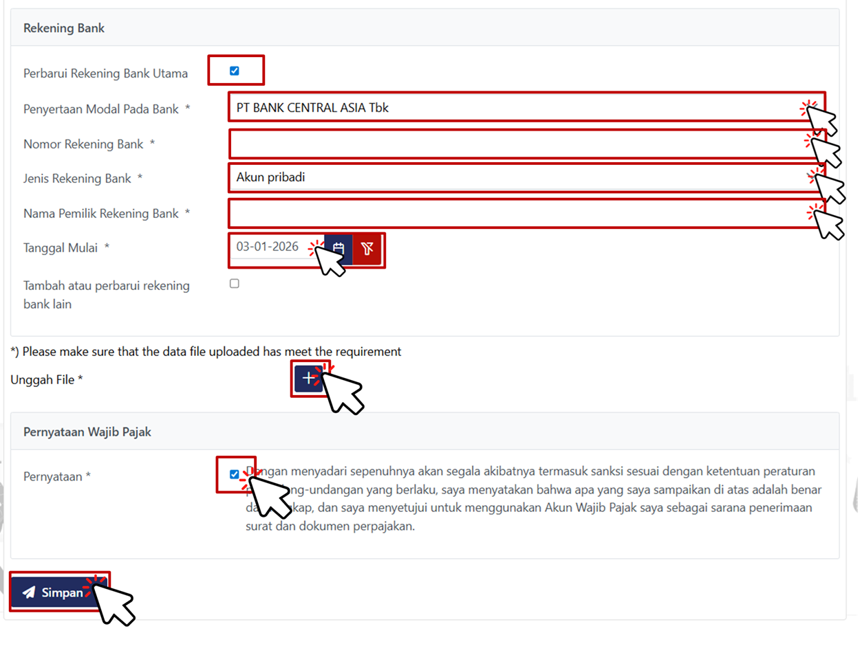 Pada Rekening Bank centang Perbarui Rekening Bank Utama