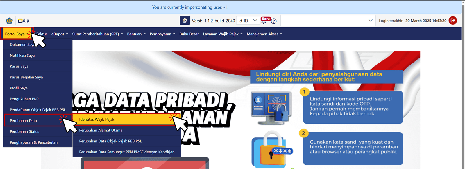 Lakukan Impersonating dengan Klik Tombol Drop Down List dan Klik Badan yang akan dilakukan Impersonating. (Skip langkah ini jika rekening yang akan diubah adalah rekening orang pribadi)
