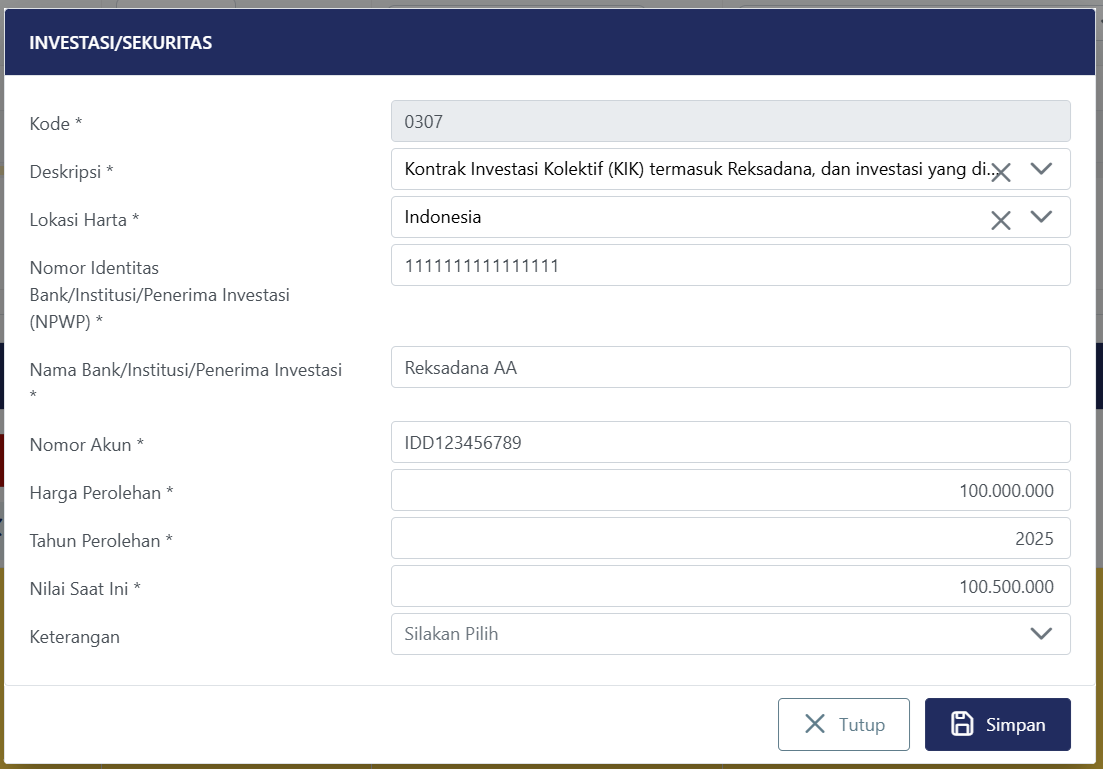 1 | Deskripsi | Diisi Kontrak Investasi Kolektif (KIK) termasuk reksadana dan investasi yang dikonversikan ke unit penyertaan |