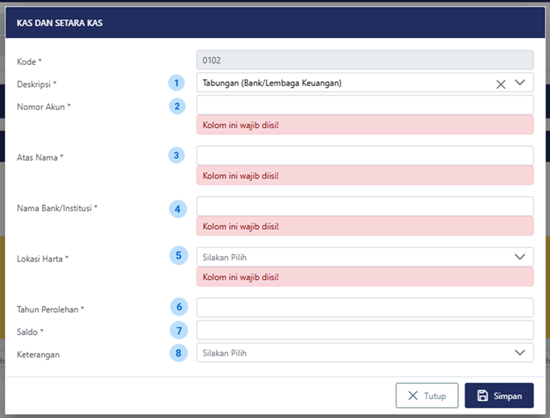6 | Tahun Perolehan | Tahun Pelaporan Harta, Misal sedang melaporkan SPT Tahunan 2025 maka isi 2025 Dalam hal harta berupa kas dan setara kas terkait program pengungkapan sukarela, tahun perolehan diisi sesuai dengan ketentuan dalam Peraturan Menteri Keuangan Nomor 196/PMK.03/2021 tentang Tata Cara Pelaksanaan Program Pengungkapan Sukarela Wajib Pajak. |