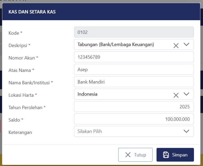 Asep ingin melaporkan SPT Tahunan PPh Orang Pribadi Tahun 2025. Asep memiliki rekening di Bank Mandiri (No Rek 123456789) dengan saldo per 31 Desember 2025 sebesar Rp100.000.000, rekening tabungan tersebut tidak ada kaitannya dengan Harta PPS/Harta Investasi PPS