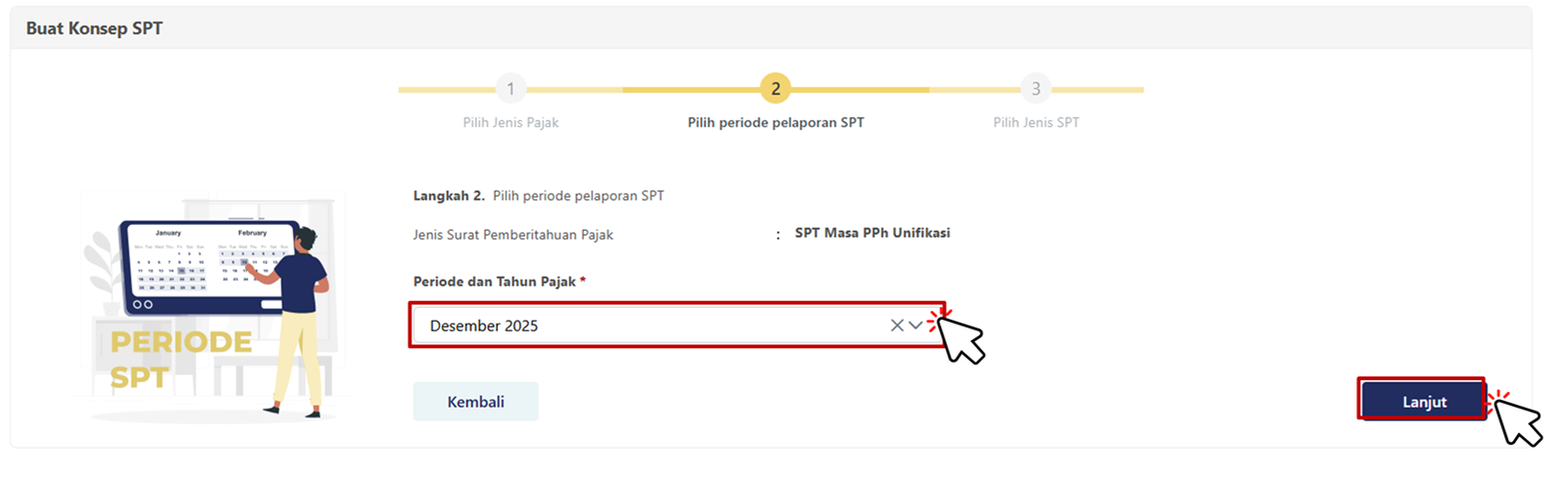 Pilih Masa dan Tahun Pajak yang ingin dilaporkan lalu klik Lanjut