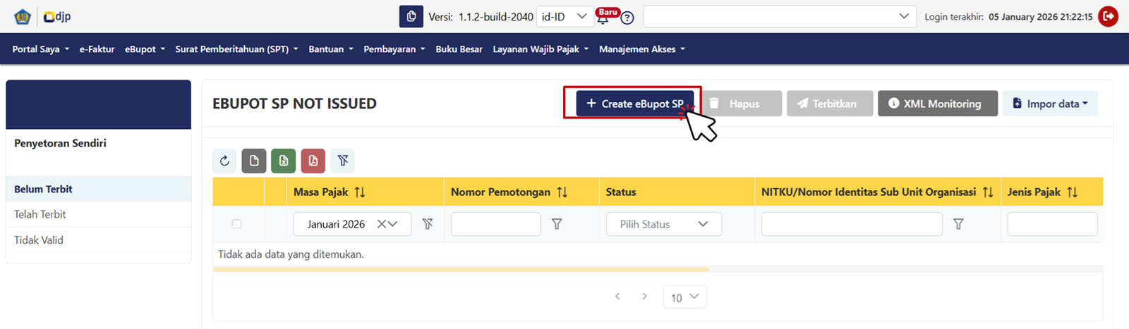 Klik Create eBupot SP