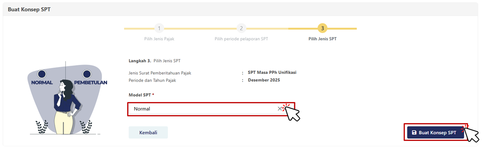 Pilih Model SPT (jika sebelumnya belum lapor maka pilih normal) lalu klik tombol Buat Konsep SPT