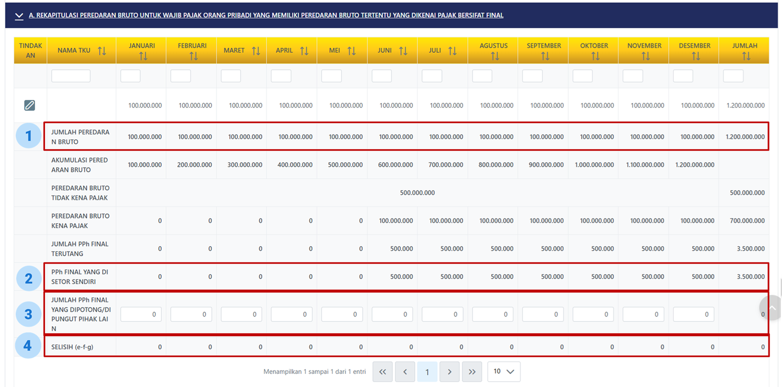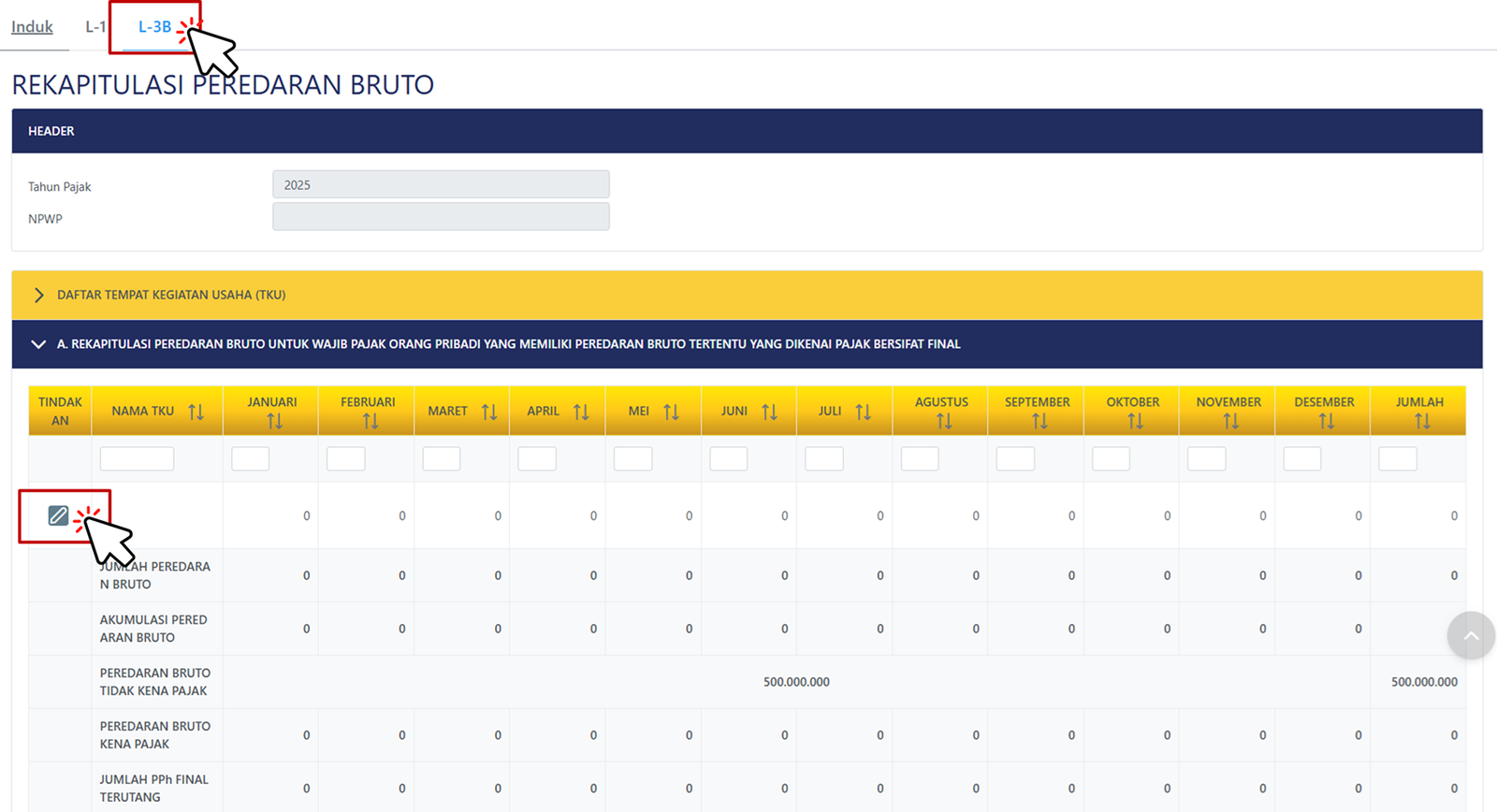 Klik tombol pensil pada A. Rekapitulasi Peredaran Bruto untuk Wajib Pajak Orang Pribadi yang Memiliki Peredaran Bruto Tertentu yang Dikenai Pajak Bersifat Final