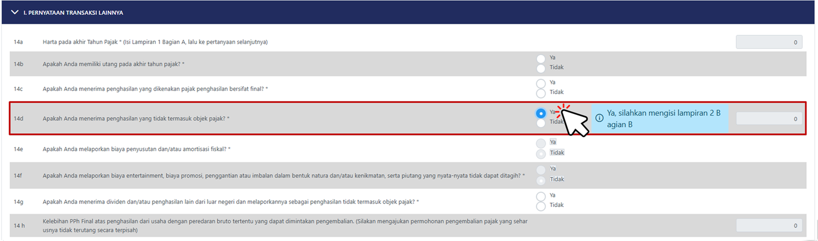 Pada pertanyaan nomor 14d Apakah Anda menerima penghasilan yang tidak termasuk objek pajak? pilih Ya