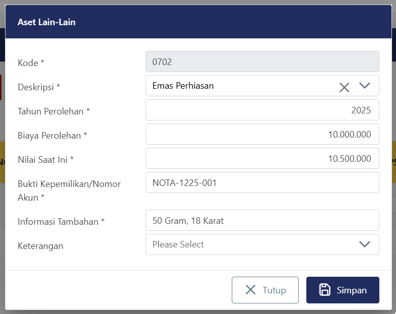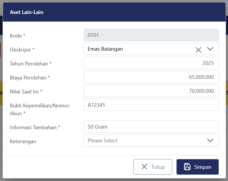 Emas Batangan: Dibeli pada tanggal 10 Agustus 2025 berupa Logam Mulia (LM) Antam seberat 50 gram dengan harga perolehan Rp65.000.000. Pada fisik emas tersebut tertera Nomor Seri Sertifikat A12345. Budi berniat menyimpannya sebagai tabungan jangka panjang