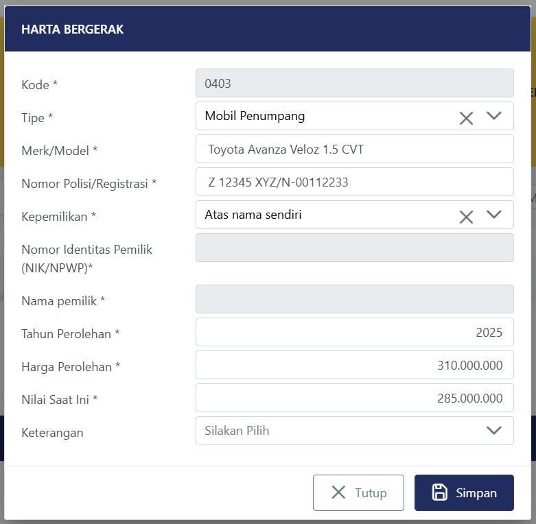 Jenis Harta: Mobil untuk Keluarganya.