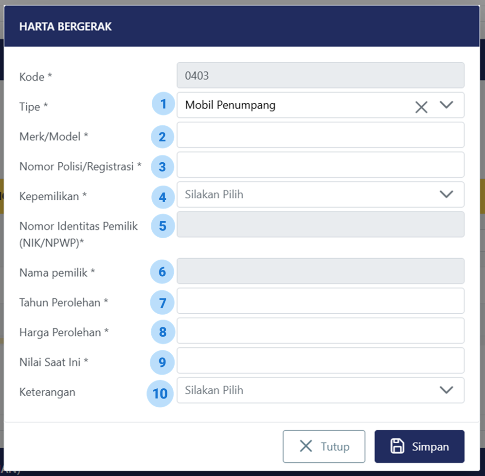 8 | Harga Perolehan | Diisi harga perolehan mobil dengan mata uang rupiah Dalam hal harga perolehan menggunakan satuan mata uang selain rupiah maka menggunakan kurs yang sebenarnya berlaku pada saat perolehan (Kurs Tengah Bank Indonesia (BI)) Dalam hal terkait dengan program pengungkapan sukarela (PPS) dan menggunakan mata uang selain rupiah maka menggunakan satuan mata uang rupiah sesuai dengan ketentuan dalam Peraturan Menteri Keuangan Nomor 196/PMK.03/2021 tentang Tata Cara Pelaksanaan Program Pengungkapan Sukarela Wajib Pajak. |