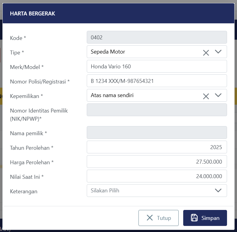 Sepeda Motor: Dibeli baru pada tanggal 15 Maret 2025, berupa motor Honda Vario 160.