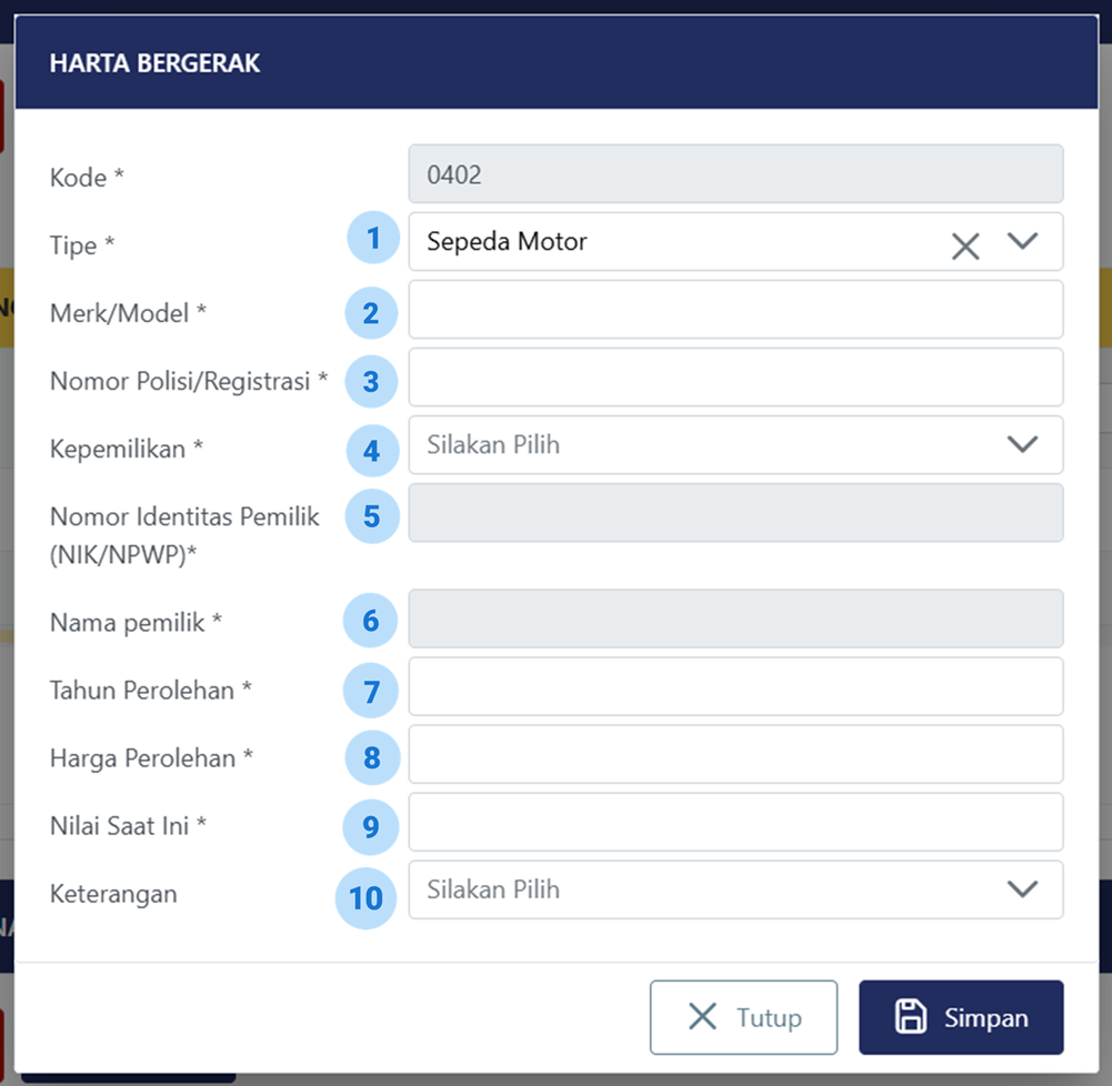 8 | Harga Perolehan | Diisi harga perolehan motor engan mata uang rupiah Dalam hal harga perolehan menggunakan satuan mata uang selain rupiah maka menggunakan kurs yang sebenarnya berlaku pada saat perolehan (Kurs Tengah Bank Indonesia (BI)) Dalam hal terkait dengan program pengungkapan sukarela (PPS) dan menggunakan mata uang selain rupiah maka menggunakan satuan mata uang rupiah sesuai dengan ketentuan dalam Peraturan Menteri Keuangan Nomor 196/PMK.03/2021 tentang Tata Cara Pelaksanaan Program Pengungkapan Sukarela Wajib Pajak. |