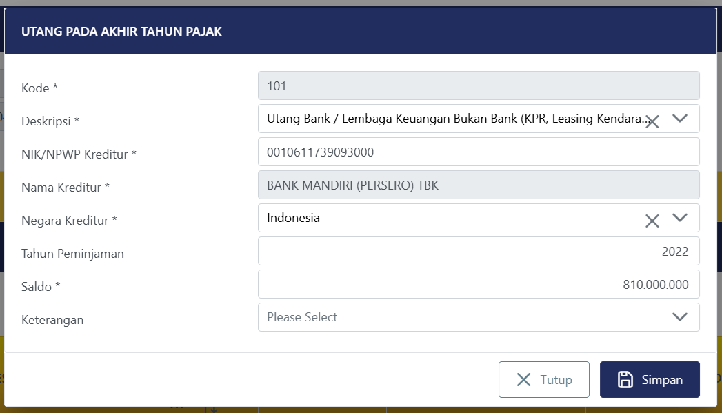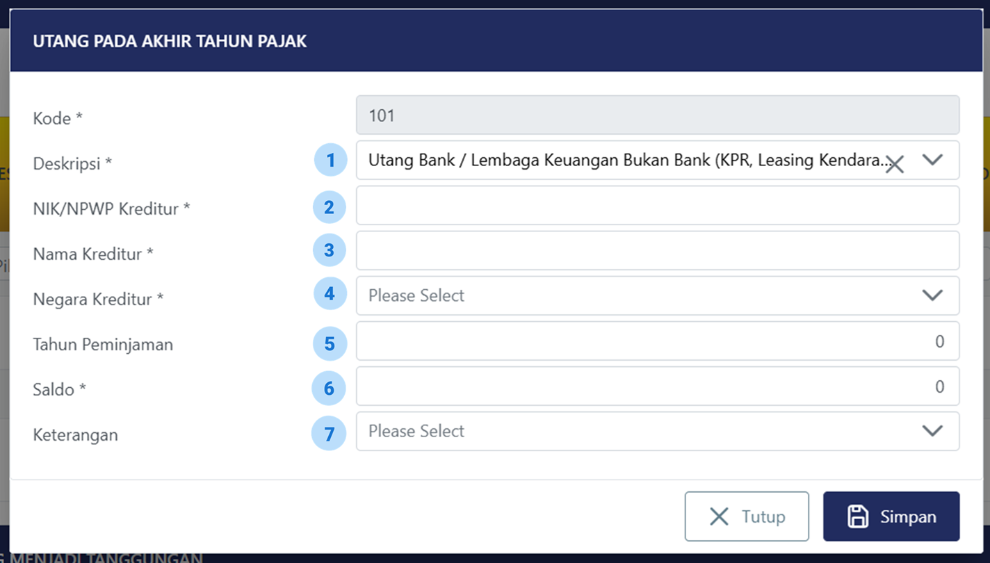 5 | Tahun Peminjaman | Diisi Tahun Perolehan Pinjaman Dalam hal utang terkait program pengungkapan sukarela, tahun peminjaman diisi sesuai dengan ketentuan dalam Peraturan Menteri Keuangan Nomor 196/PMK.03/2021 tentang Tata Cara Pelaksanaan Program Pengungkapan Sukarela Wajib Pajak. |
